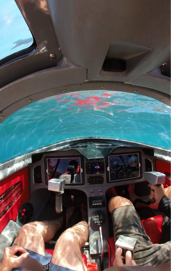 Built around advanced marine technology, the Q400 features twin impeller jet propulsion, foot pedal steering, and a two-axis electro-hydraulic control stick that gives you precise command over pitch and roll. The cockpit includes a waterproof Sihovision 16” navigation display, a Maratron N2K computer system for engine monitoring, and a front-facing snorkel camera for situational awareness. From high-speed gliding to slow-motion surface maneuvers, the Q400 is all about intelligent control.
